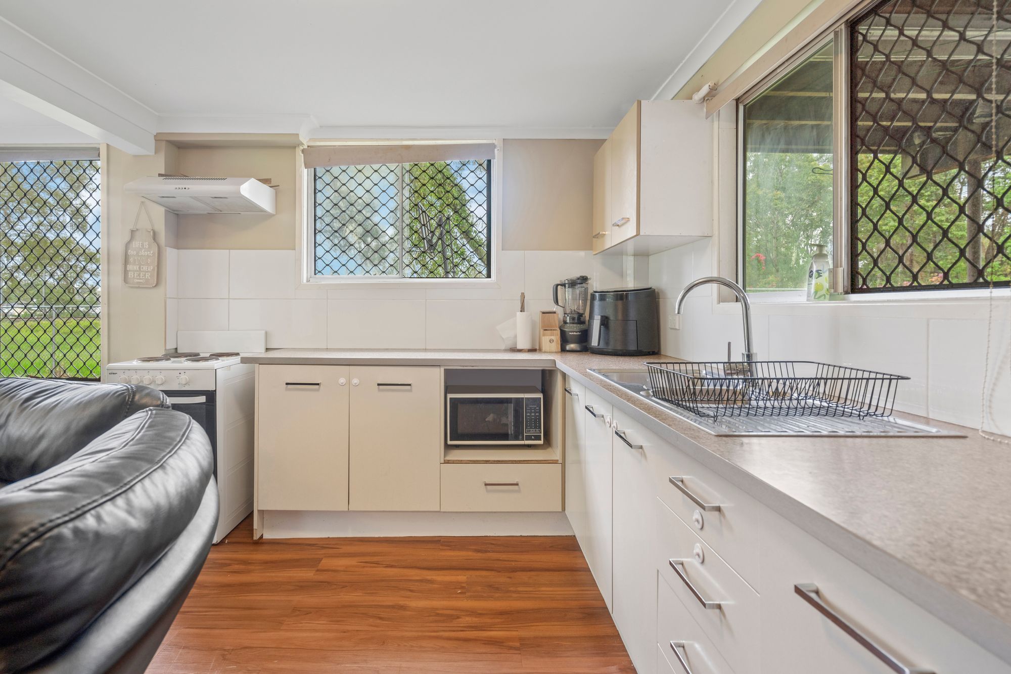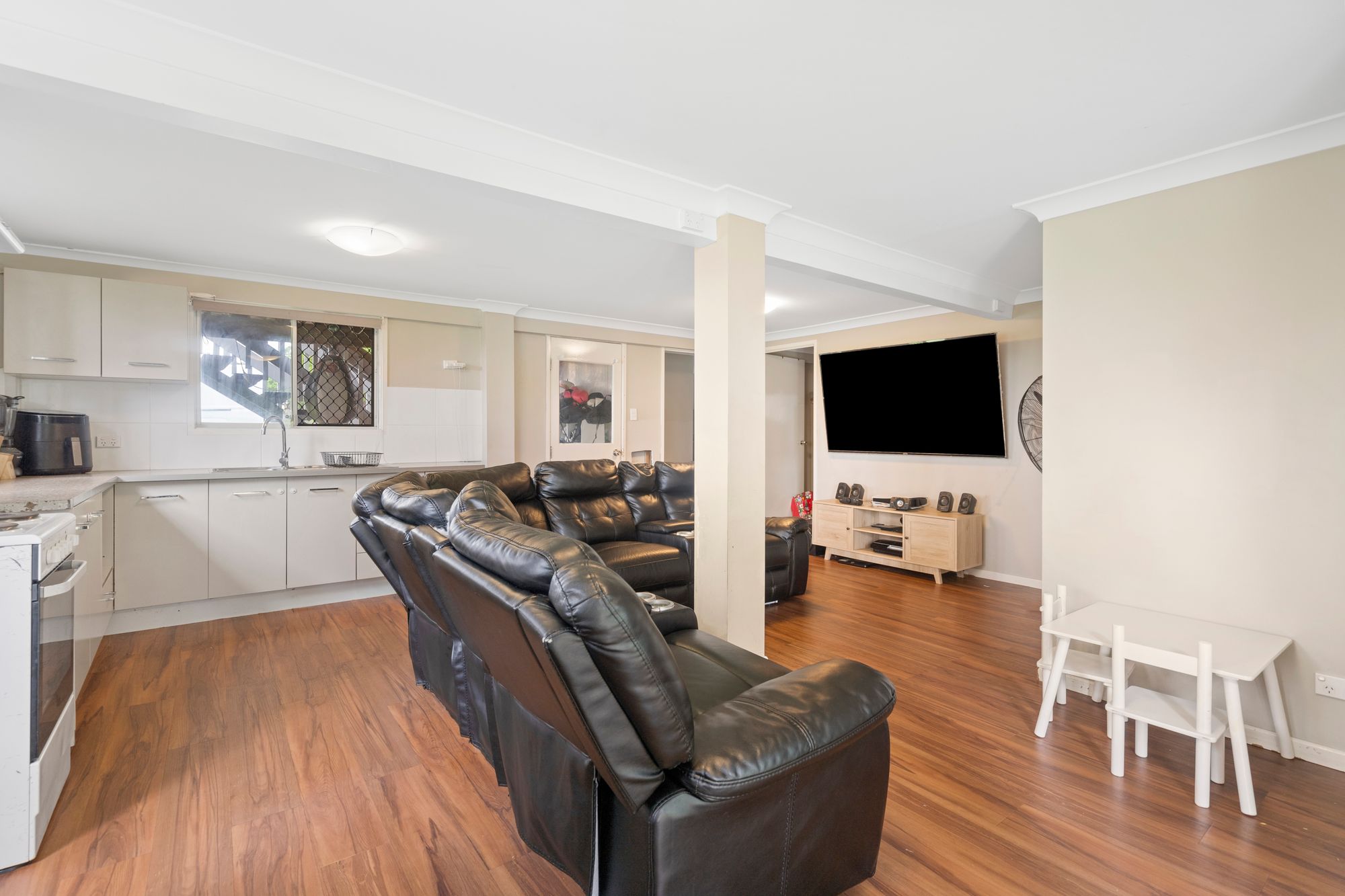 Living/ dining area with ceiling fan with air-conditioner Kitchen with electric hot plate cooktop and oven and storage with access to stairs to backyard 3 bedrooms with built-ins and ceiling fan Bathroom with bath over shower